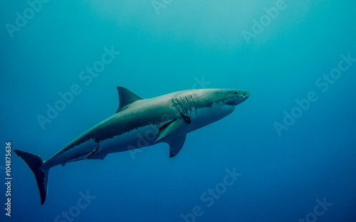 Fototapeta premium Tagged great white shark for conservation swimming in the blue Pacific Ocean at Guadalupe Island in Mexico
