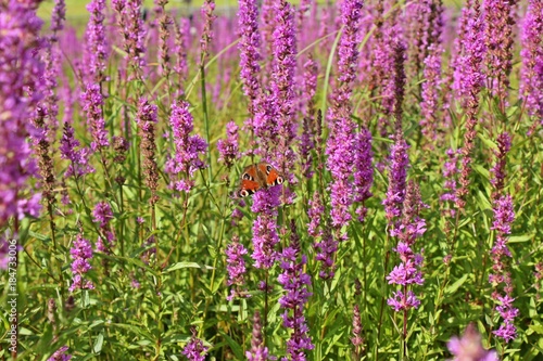 Naklejka premium Tagpfauenauge (Aglais io) an Gewöhnlichem Blutweiderich (Lythrum salicaria)...
