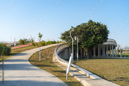 Fototapeta premium Taichung Central Park at the Shuinan Economic and Trade Area in blue sky sunny day. Former Shuinan Airport, lot of green space in here, the second largest park in Taiwan. Xitun District, Taichung City