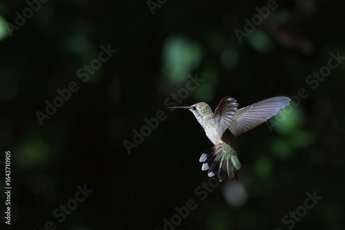 Naklejka premium Tail feathers spread and wings wide in unique, agile, controlled flight of hummingbird against dark, natural background