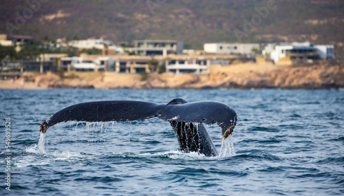 Fototapeta premium Tail of the humpback whale (Megaptera novaeangliae) on the background of the Mexican coast. Mexico. Sea of Cortez. California Peninsula.
