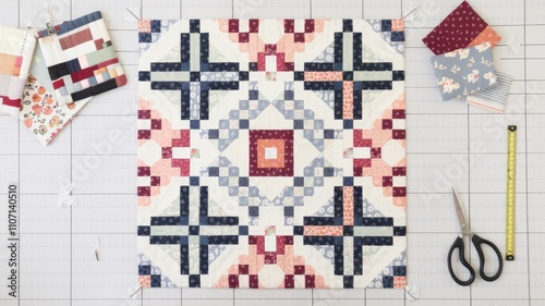 © Lubos Chlubny, Obraz premium Tailor creating patchwork quilt with geometric pattern on cutting mat