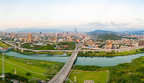 Fototapeta premium Taipei City Aerial View - Asia business concept image, panoramic modern cityscape building bird’s eye view under sunrise and morning blue bright sky, shot in Taipei, Taiwan