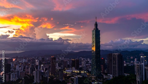 © Billy, Fototapeta premium Taipei City Skyline at Sunset: Dramatic Sky and Iconic Tower Illuminated