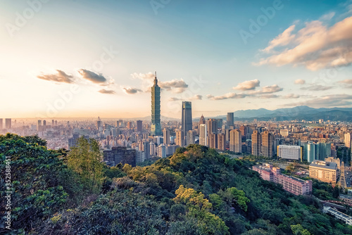 © Stockbym, Fototapeta premium Taipei city viewed from the hill at sunset, Taiwan