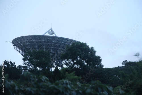 © YiChuan, Fototapeta premium Taipei, Taiwan, - June 29th 2025 - A large, weathered satellite dish antenna at Yangmingshan Earth Station tilted towards the twilight sky.