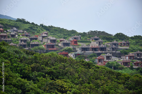Fototapeta premium Taiwanese cemetery on a cliffside within a forest, with colorful shrines, Taipei, Taiwan