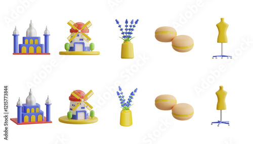 Obraz premium Taj Mahal, Windmill, Lavender Vase, Macarons, and Mannequin. 3D Icon High Quality Render