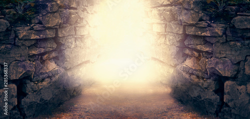 Naklejka premium Tajemnicze tło zdjęcia fantasy, magiczny szlak wiodący przez kamienne ściany...