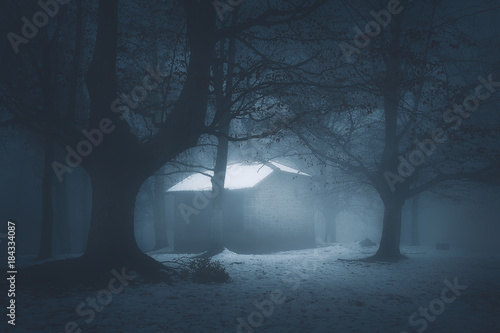 Naklejka premium tajemniczy dom w lesie ze śniegiem w zimie