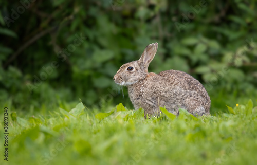 © alan1951, Fototapeta premium Taken from ground level for an unusual angle, the image shows a detailed profile portrait of a rabbit sitting on the grass with a natural background