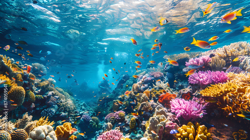 © Akharadat, Fototapeta premium Taking a scuba dive in crystal clear tropical waters, exploring vibrant coral reefs and marine life, with colorful fish swimming around,