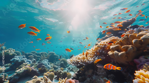 © Akharadat, Fototapeta premium Taking a scuba dive in crystal clear tropical waters, exploring vibrant coral reefs and marine life, with colorful fish swimming around,