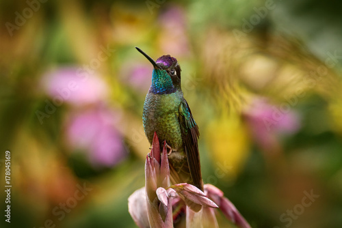 © ondrejprosicky, Obraz premium Talamanca hummingbird, Eugenes spectabilis, flying next to beautiful orange flower with green forest in the background, Savegre mountains, Costa Rica. Costa Rica nature. Bird fly in wildlife.