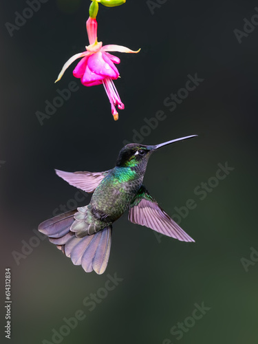 © FotoRequest, Fototapeta premium Talamanca Hummingbird in flight feeding on pink flower against green background
