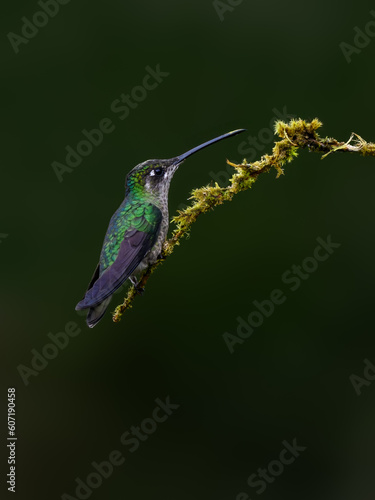 Obraz premium Talamanca Hummingbird portrait on mossy stick against green background