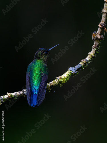 Fototapeta premium Talamanca Hummingbird portrait on mossy stick against green background