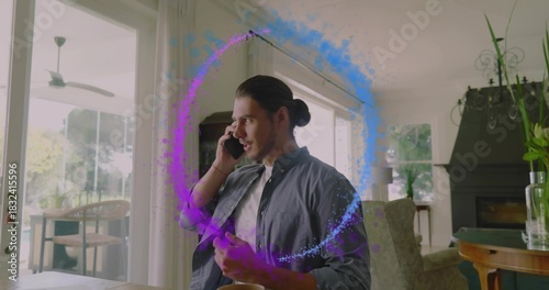 © vectorfusionart, Naklejka premium Talking bun-haired man in dark shirt holding phone, gesturing at wooden table at home, purple ring