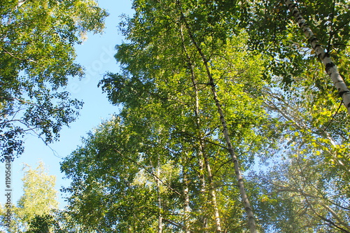 © olyasolodenko, Fototapeta premium Tall birch trees in forest. Looking up