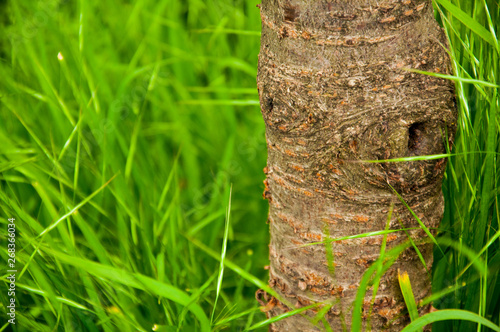 Obraz premium tall bright green grass grows around a small tree