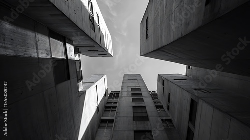 Fototapeta premium Tall brutalist towers viewed from a courtyard upward, concrete dominating...
