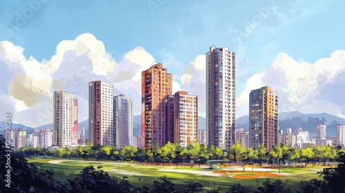 Fototapeta premium Tall buildings and coins are the same height