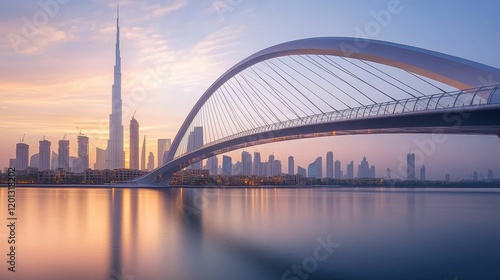 Naklejka premium Tall buildings, arching bridge reflected on tranquil water.