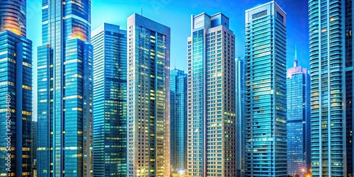 © suchetpong, Obraz premium Tall buildings covered with glowing lights in light blue hues