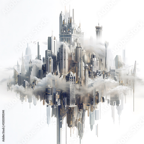 © Sumonrat, Naklejka premium Tall buildings in a fantasy city covered in clouds