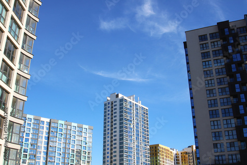 © Vera Aksionava, Naklejka premium Tall buildings under a bright blue sky create a stunning landscape