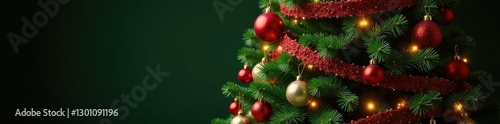 Fototapeta premium Tall evergreen tree swathed in crimson and gold, evergreen tree, Christmas decorations, holiday decor