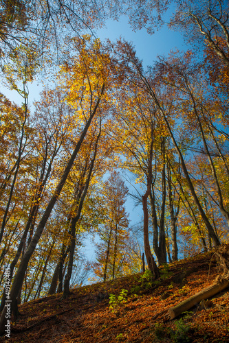 Fototapeta premium Tall forest trees with yellow-golden autumn leaves on a steep mountain slope...