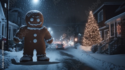 © GoodandEvil, Fototapeta premium Tall gingerbread man in a snow-covered festive town