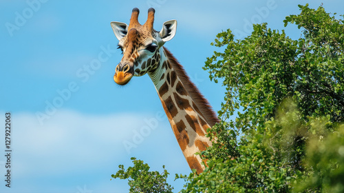 © PuriStudio, Fototapeta premium tall giraffe peeking through lush green foliage under clear blue sky