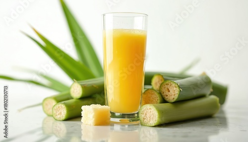 Naklejka premium Tall glass holds fresh sugarcane juice surrounded by cut cane stalks and leaves. A cube of sugar sits nearby on a reflective surface. This drink offers natural sweetness and energy.