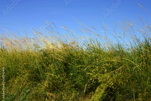© Martina Simonazzi, Fototapeta premium tall grass and blue sky background, high grass on wind under azure blue sky in summer
