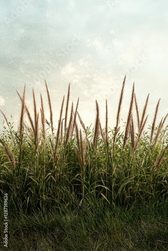 © Balaraw, Fototapeta premium Tall grass and weeds blowing in the wind against an overcast sky.