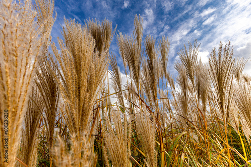 Fototapeta premium Tall grass pampas against the blue sky tidy in the garden