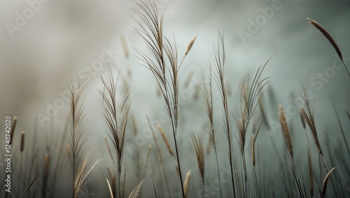 © Tetiana, Fototapeta premium Tall grass plumes in field with soft diffused light creating hazy atmosphere
