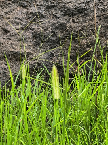© Thanakrit, Obraz premium Tall Grass Seed Head with Mountain Backdrop