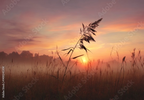 © El Media, Obraz premium Tall Grass Silhouette Against a Foggy Field at Sunrise or Sunset