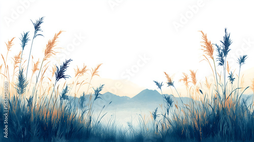 © Marsy, Obraz premium Tall grasses sway gently in the misty dawn, silhouetted against distant mountains.