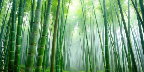 Fototapeta premium Tall green bamboo stalks densely cluster together in a serene misty forest environment, serene atmosphere, green bamboo