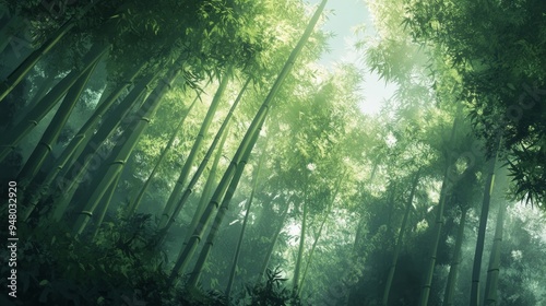 © Zaenal, Obraz premium Tall, green bamboo trees swaying gently in the breeze, serene and lush