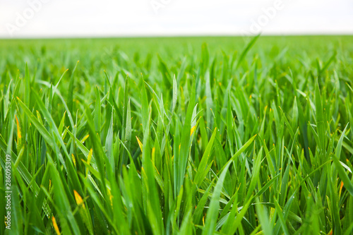 © Vadym, Fototapeta premium Tall green grass in the field. Spring meadow landscape on a sunny day. Summer time. Nature eco friendly photo. Wheat growing. Agriculture concept. Wallpaper with sky.