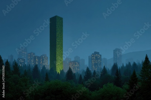 © Сергей Захаров, Obraz premium Tall green skyscraper stands amidst foggy forest, glowing softly