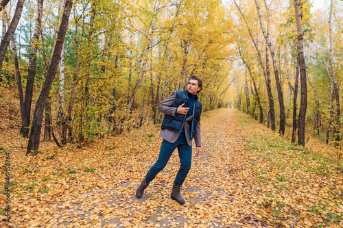 Fototapeta premium Tall handsome man walking in the autumn alley