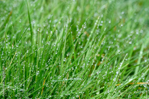 Obraz premium Tall lawn grass covered in water droplets after a morning rain, as a nature...