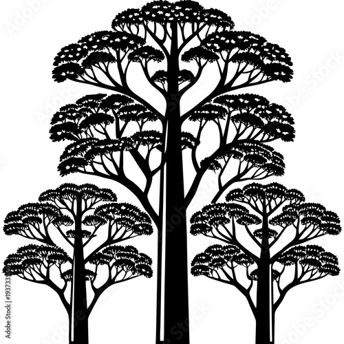 © Muhammad, Obraz premium Tall layered trees vector illustration with black silhouettes on white background for design and decoration