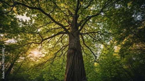 Fototapeta premium Tall, leafy tree trunk reaches skyward; sunlight through green canopy